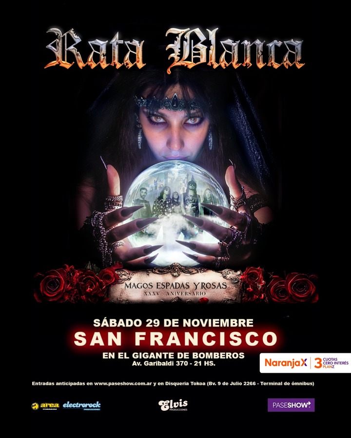 La ciudad de San Francisco recibirá el próximo sábado 29 de noviembre, a las 21 horas, a la reconocida banda argentina Rata Blanca, que llegará para conmemorar el 35° aniversario de su álbum “Magos, Espadas y Rosas”. El concierto tendrá lugar en El Gigante de Bomberos, con apertura de puertas desde temprano para facilitar el ingreso del público.